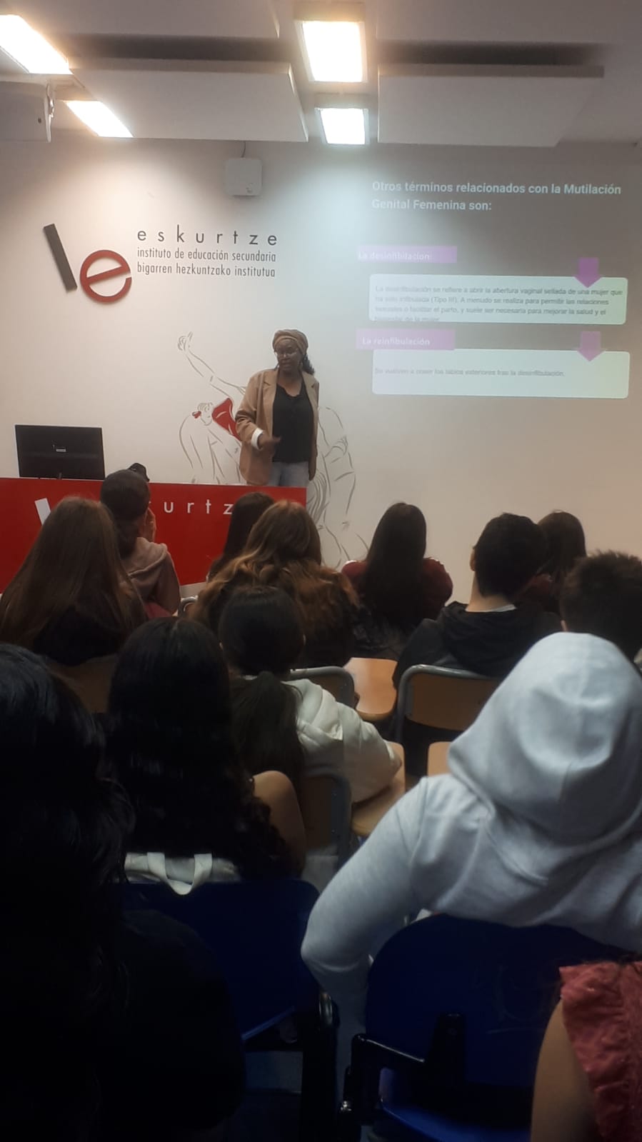 Asha Ismail, dona somali de Kenya supervivent de Mutilació Genital Femenina (MGF) i fundadora de Save a Girl Save a Generation, imparteix formació a alumnat de secundària i professorat del centre educatiu ES Eskurtze de Bilbao per a la ruptura d’estereotips sobre la MGF i la prevenció d’aquesta pràctica que vulnera greument els drets de les dones.