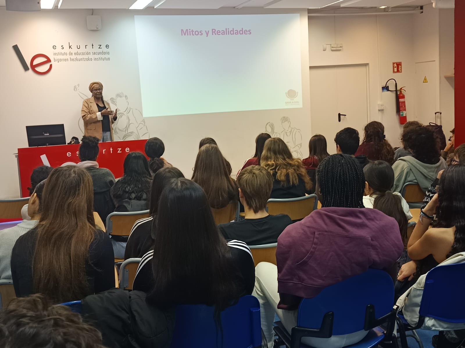 Asha Ismail, dona somali de Kenya supervivent de Mutilació Genital Femenina (MGF) i fundadora de Save a Girl Save a Generation, imparteix formació a alumnat de secundària i professorat del centre educatiu ES Eskurtze de Bilbao per a la ruptura d’estereotips sobre la MGF i la prevenció d’aquesta pràctica que vulnera greument els drets de les dones.