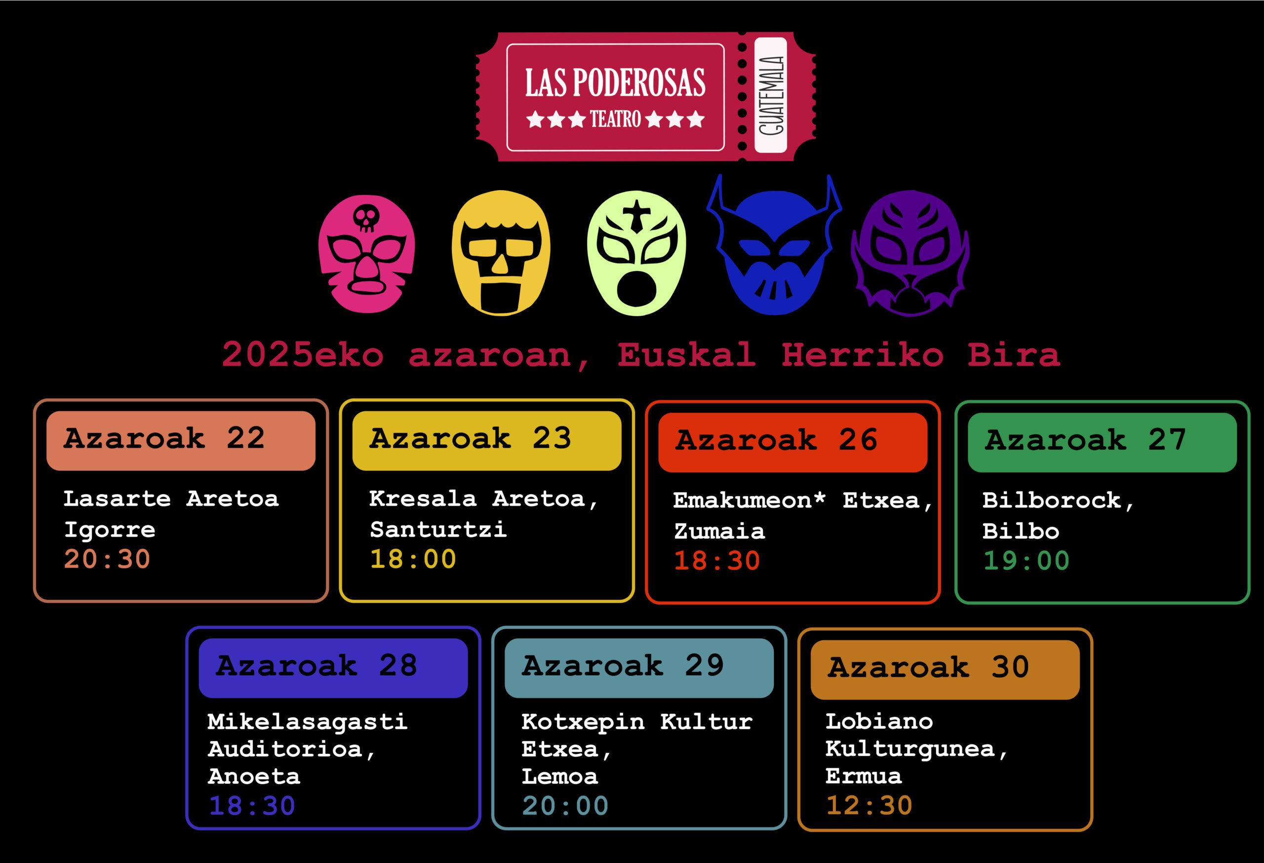 Guatemalako Las Poderosas Teatro konpainiak, Emakume Migratzaileen aldeko biraren baitan, 2025eko azaroaren 16tik 30era bitartean, Euskal Herriko zein Espainiar estatuko hainbat txokoetan emanaldiak eta liburu aurkezpenak eskainiko dituzte.